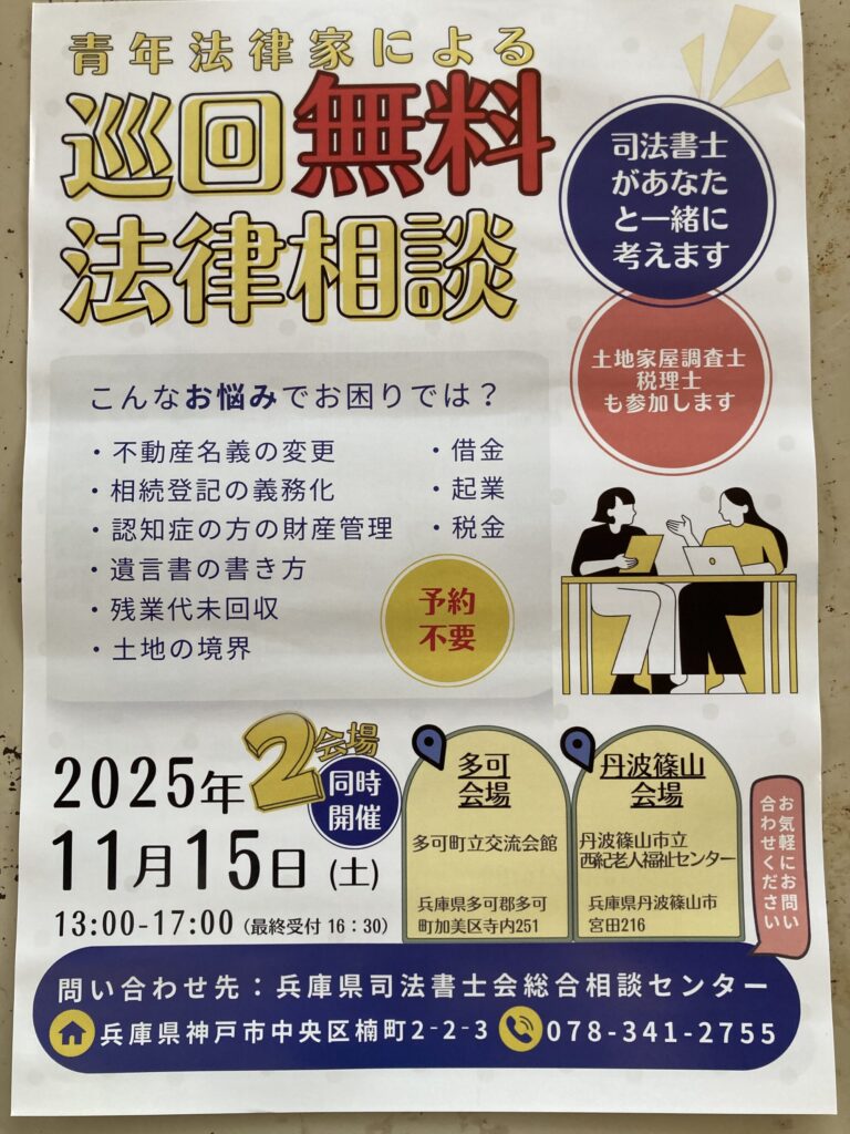 青年法律家による巡回無料法律相談会開催! 2025年11月7日 最終更新日時 : 2025年11月7日 おもてたけし 令和7年11月15日、13:00~17:00(最終受付16:30)兵庫県多可郡の多可町立交流会館及び丹波篠山市の丹波篠山市立西紀老人福祉センターにおきまして税理士、土地家屋調査士及び司法書士による巡回無料相談会を開催します。 もし、多可郡、丹波篠山市またはその周辺に住んでいらっしゃる方で税理士、土地家屋調査士、司法書士に相談したいことがあるなら是非この機会をご利用ください! Follow me!